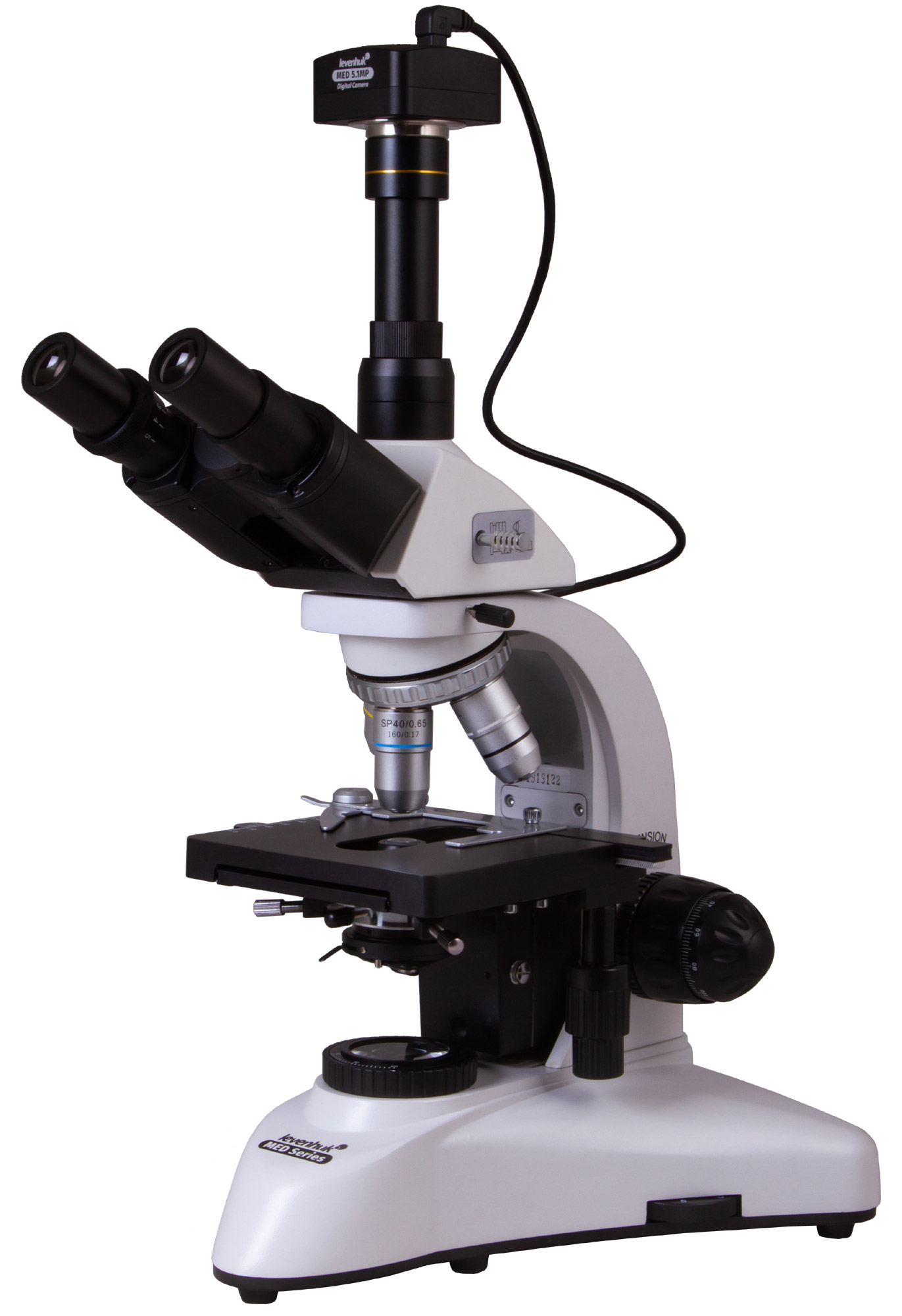 Magnification: 40–1000x. Trinocular head, 5.1MP digital camera, semi-plan achromatic objective lenses, an Abbe condenser with an iris diaphragm and a filter holder