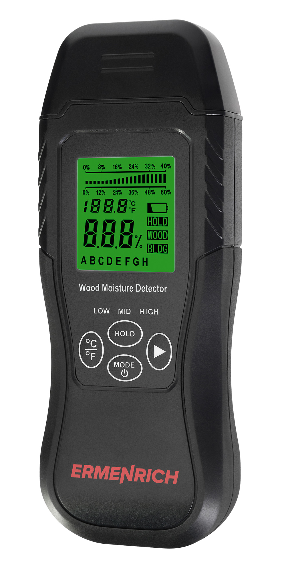 The Ermenrich Wett MW30 portable moisture detector (moisture meter) enables you to quickly measure the moisture content of building materials and wood products. This is especially relevant for material procurement, manufacturing, carpentry, and household maintenance. The device can work on materials such as cardboard, lumber, concrete, plaster, etc. It has a built-in thermometer that can measure temperature in two units of measurement: Celsius and Fahrenheit.