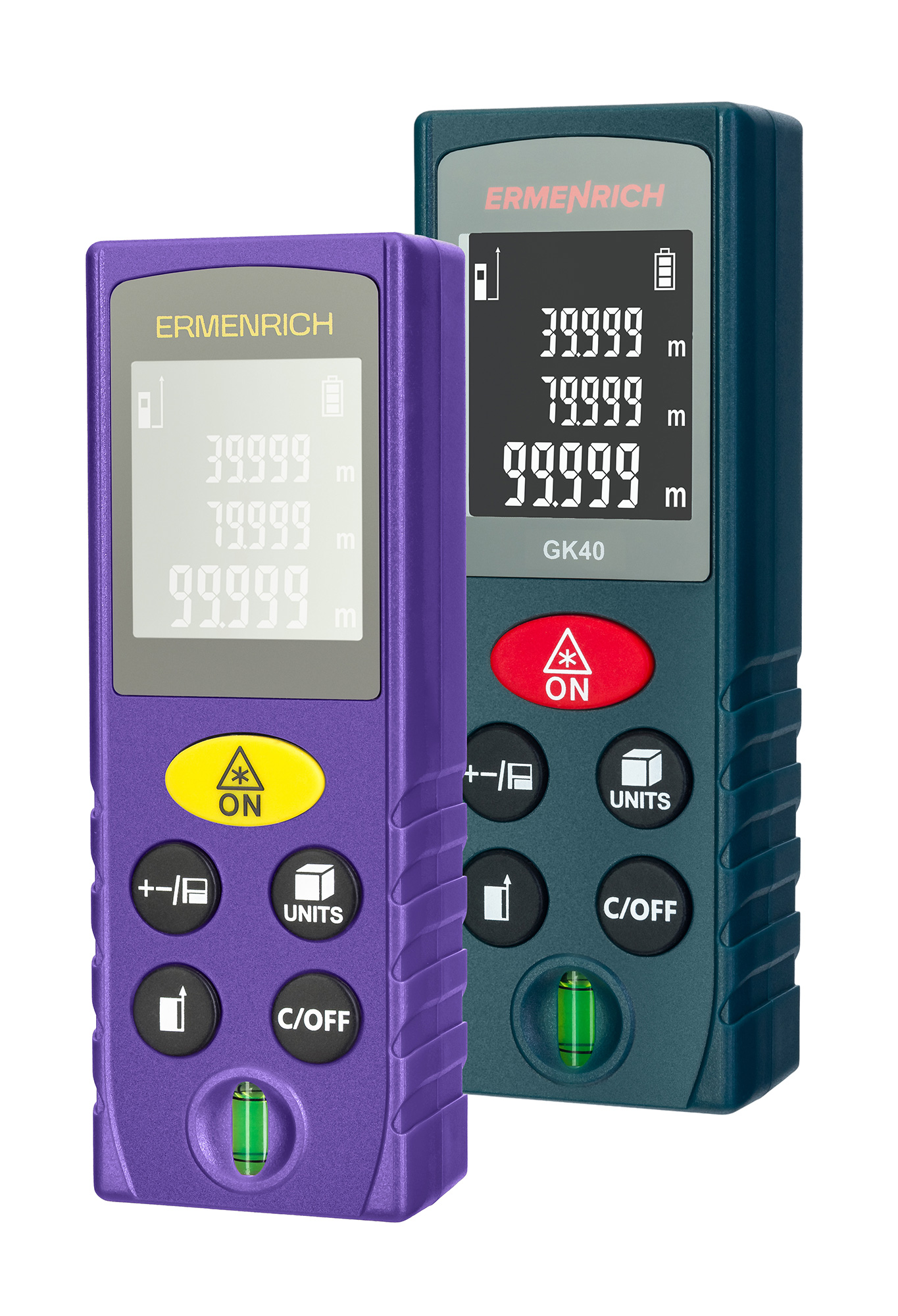 The Ermenrich Reel PLUS GK40 laser meter is used to solve many construction, repair, engineering, or household tasks. It enables you to take accurate measurements within 40 meters (130ft) and to calculate volume and area. For measurements under difficult conditions, when it is impossible to position the meter correctly, there is a Pythagorean theorem feature – using indirect measurements, it helps to calculate the distance to the desired point. The device also has a bubble level, which can be used for the precise installation of the meter, and as an independent tool.