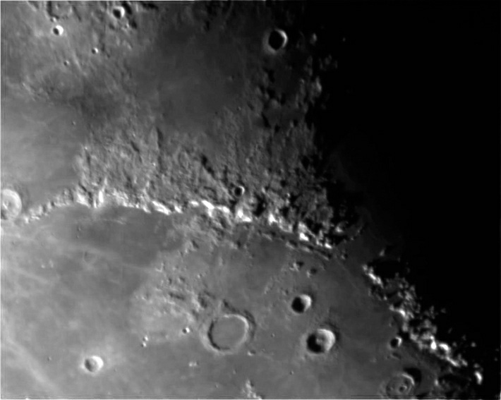This shot and all subsequent images are made with the Levenhuk SkyMatic 127 GT MAK telescope and QHY-5 telescope camera. The series of images was processed using the Registax image-editing program. When observing the Moon, you should also think about the atmospheric turbulence. The height of the Moon should be more than 30 degrees to prevent the image-degrading effect of the turbulence.